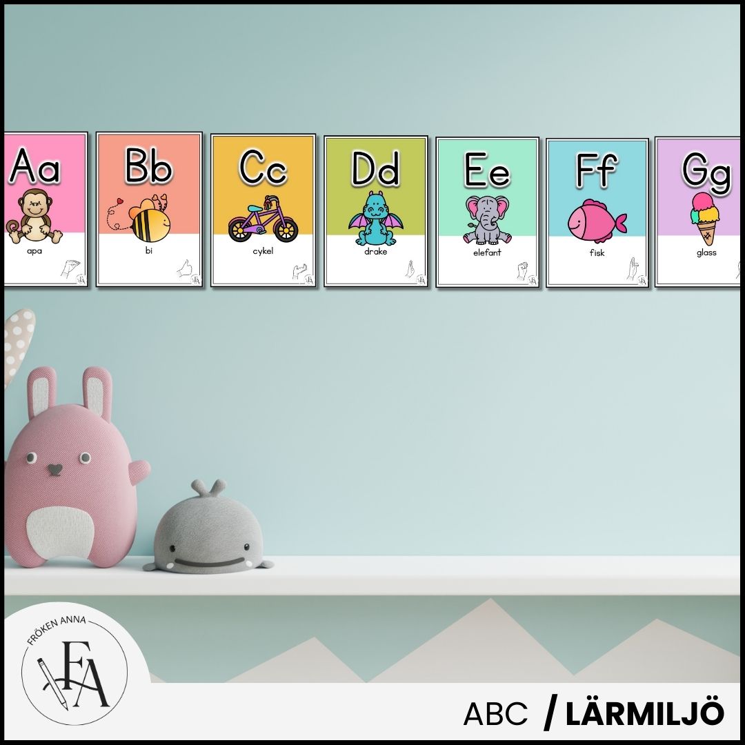 Väggalfabet i tema rainbow med TAKK (tecken som stöd). Alfabetet levereras som A4 och A5.