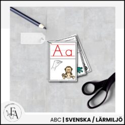 Väggalfabet med tecken som stöd. A4 och mindre småkort ingår att använda på t.ex. en nyckelring.