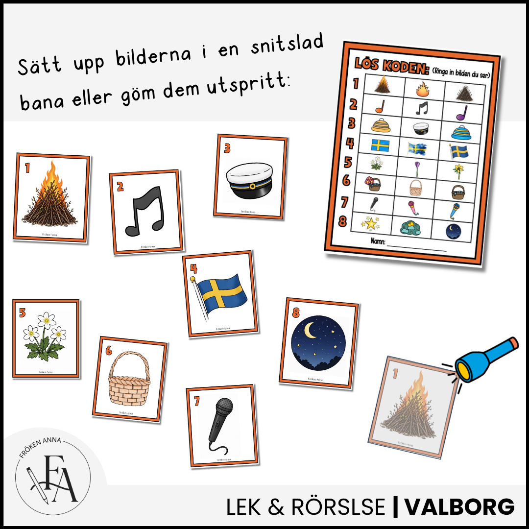 Bjud in till en rolig skattjakt till Valborg där barnen får leta efter passande doodles och träna sin observationsförmåga! Perfekt för förskola och lågstadium – ute på gården, i parken eller i skogen.