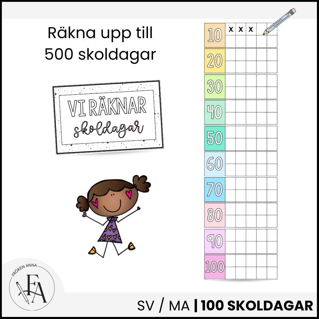 Materialet innehåller ramar i regnbågsfärger och kan användas för att räkna från 100 ända upp till 500 skoldagar. Perfekt att ha synligt i klassrummet och att använda vid firanden som 100 skoldagar i skolan.