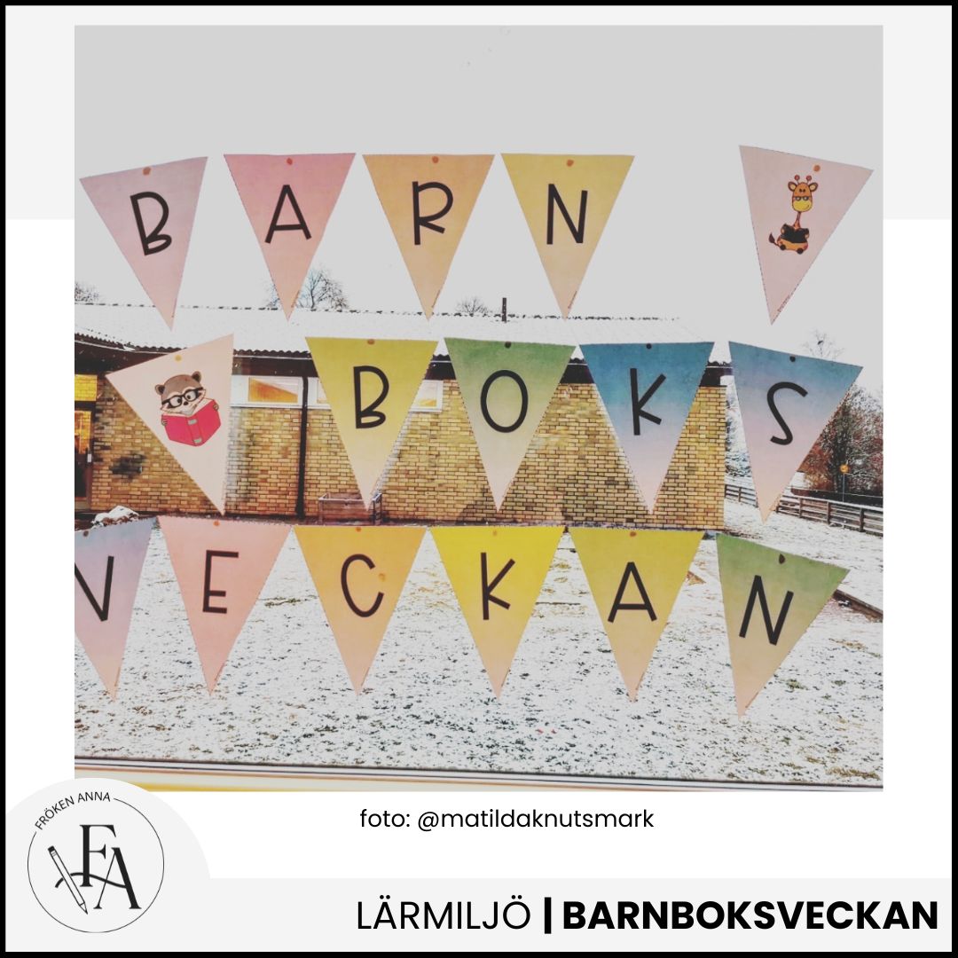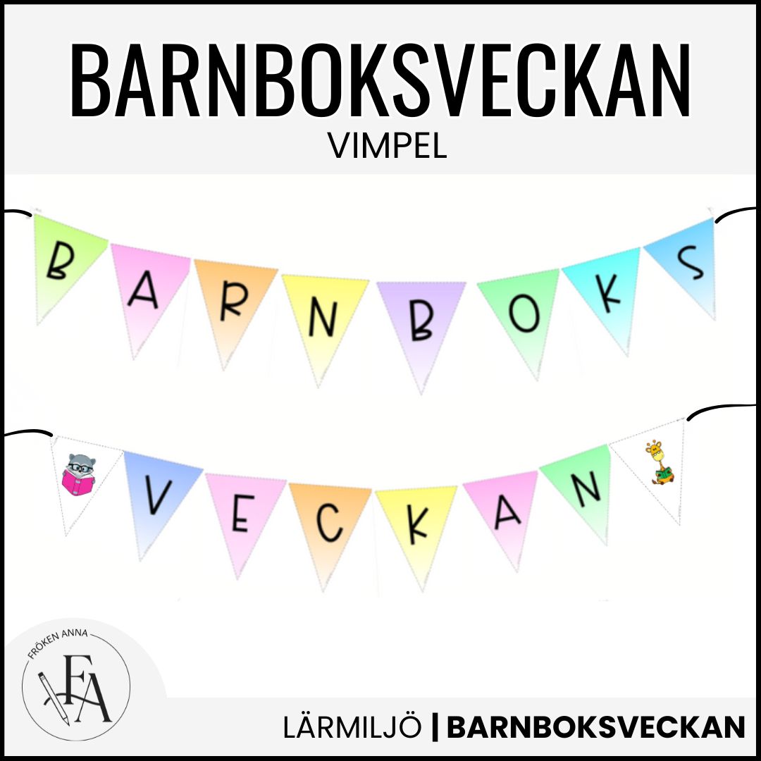 En färgglad och inbjudan vimpel att sätta upp i klassrummet, biblioteket eller annat utrymme för att uppmärksamma barnboksveckan.