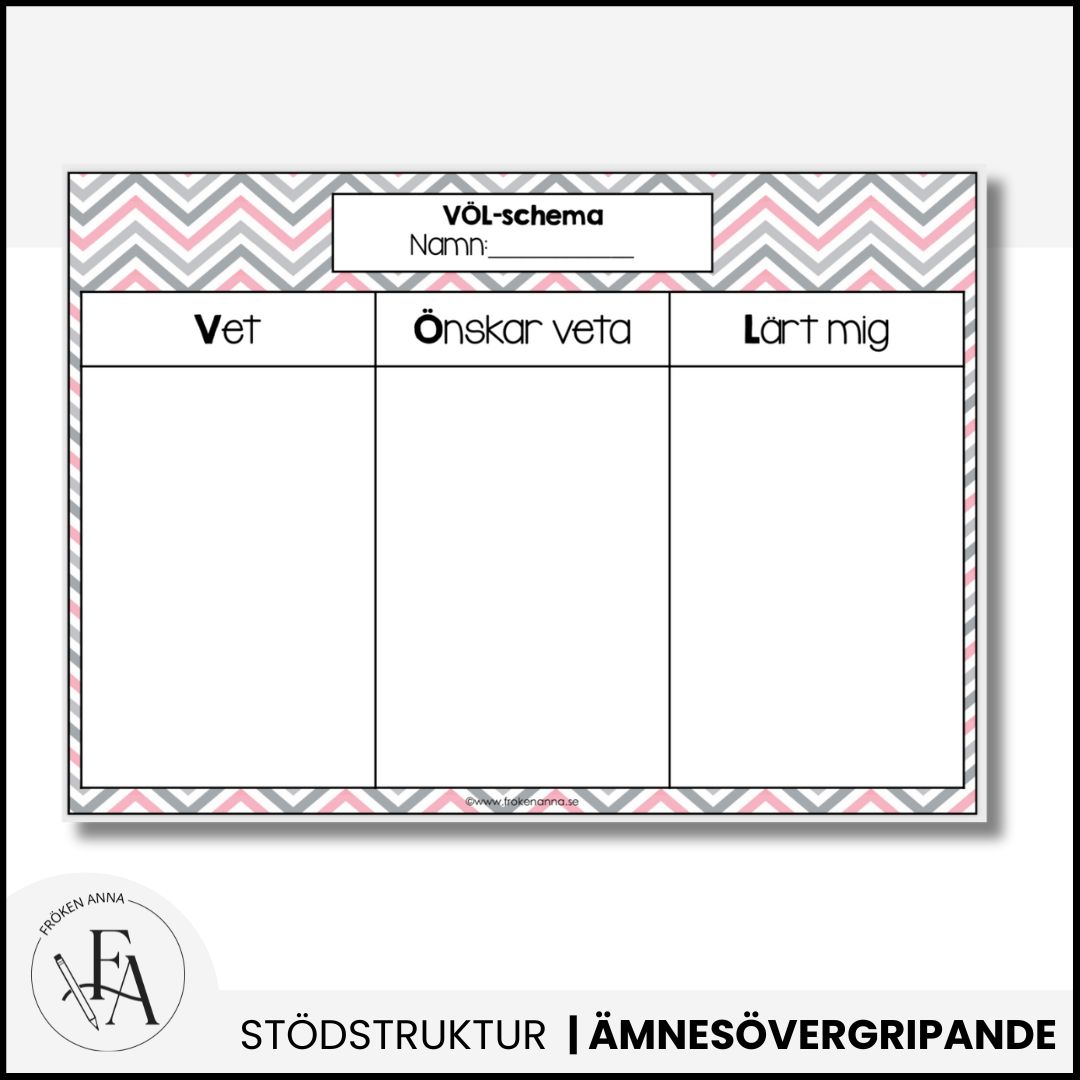VÖL-schema att använda vid uppstart av ett nytt arbetsområde, låt eleverna fylla i vad de vet, önskar lära sig och har lärt sig efter arbetsområdets slut.